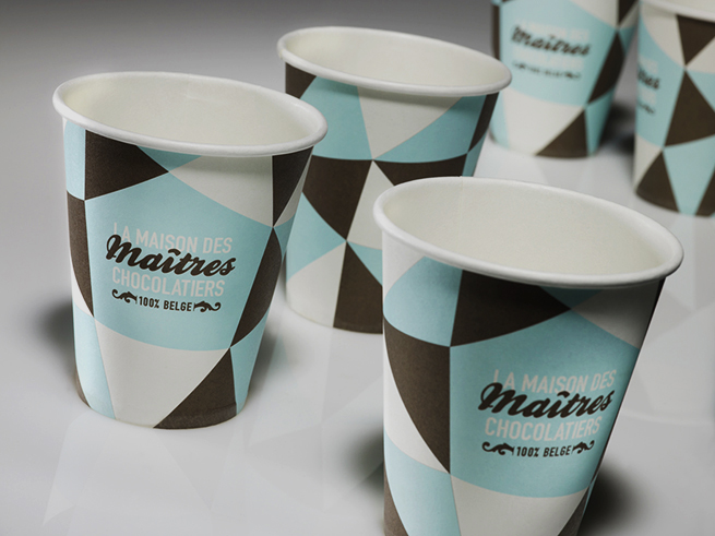 Details including gift boxes, carrier bags and paper cups, as well as staff aprons, add to the high quality ambience surrounding these master chocolate makers.