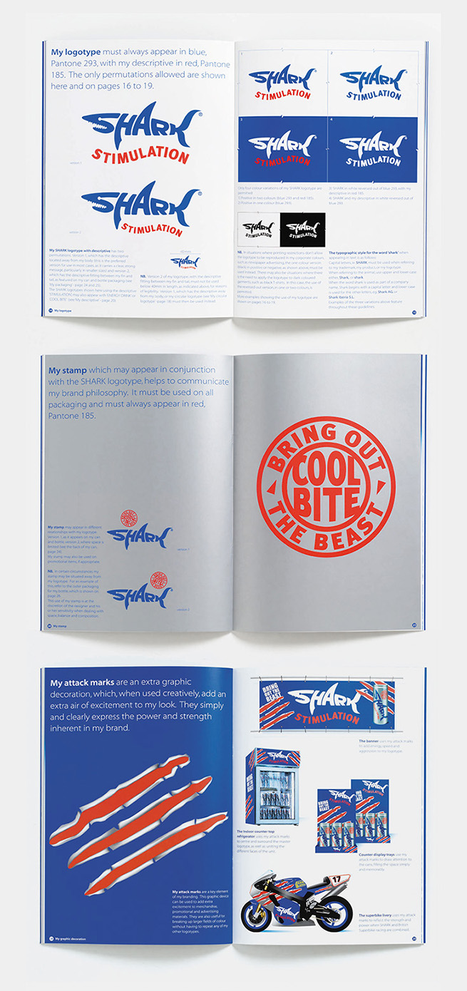 Utilizzando le lettere per creare il motivo dello squalo di Shark, il design può essere adattato a molti alfabeti, incluso il cinese, l’arabo e il cirillico, così come a quello latino. Il marchio è riuscito a trarre vantaggio dal mercato degli energy drink già creatosi, sfruttando colori associati all’energia e alle bevande rinfrescanti e al contempo riecheggiando le tonalità del mare nella forma dello squalo.